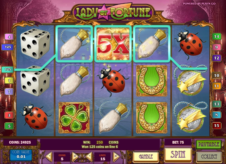 Игра начинается с красивого ролика, в котором появляется сама Госпожа Фортуна, приглашающая окунуться в мир азартных вращений. На экране расположились пять катушек и 15 линий, приносящих призовые баллы. Допускается изменение участвующих в раунде позиций. В роли символов выбраны атрибуты гадалки: приносящие удачу подковы, лепестки клевера, волшебные амулеты, игральные кости и счастливые семерки.